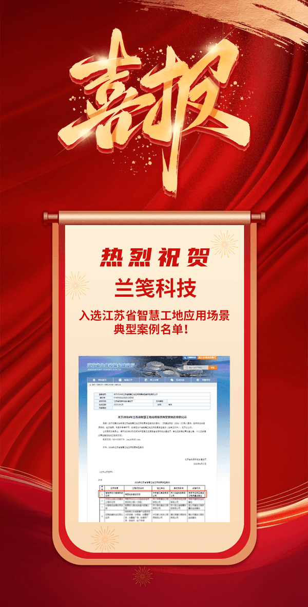 喜報(bào)!熱烈祝賀蘭箋科技入選江蘇省智慧工地應(yīng)用場景典型案例名單!
